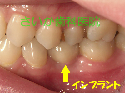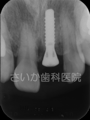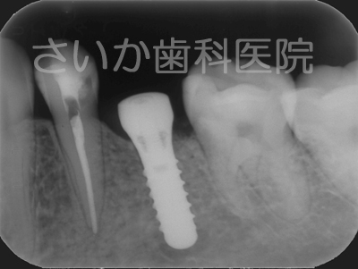 両隣に歯がありますからブリッジでも治療できるケースです。出来るだけ健全な歯はそのままにして治療するという方針で,インプラントを利用しました。下のレントゲン写真がインプラントを入れた手術後のものです。