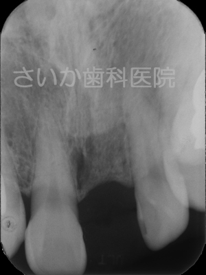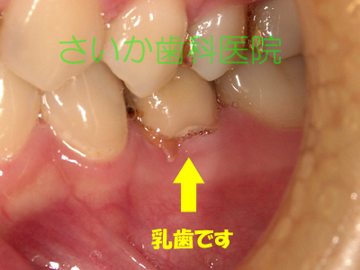 上の写真は治療前の状態です。成人の方ですが先天的に永久歯が一本少なかったので,乳歯が残っていました。その乳歯も根の吸収が進み,ぐらぐらになってきました。下のレントゲン写真を見ていただければ根がなくなっているのがわかります。