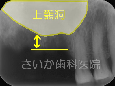 上の奥歯2本を歯周病で失ったため,骨が吸収しています。ヒトの上あご内部には「上顎洞」と呼ばれる空洞があるため,骨の厚みは矢印で示した厚みしかありません(上図右)。