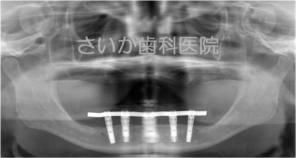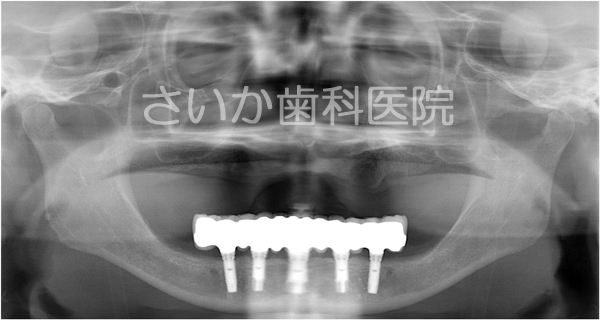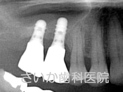 手術後,しばらくしますと突きだしたインプラント周囲には骨が自然に出来てきます。骨の再生に人工的な物を使用せず,移植も必要としないため,患者様への負担は少ない治療法のひとつです。下の写真はインプラントを入れて5年が経過した写真です(パノラマレントゲンのため,画質が粗くなっています)。